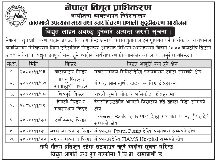 काठमाडौं । आजदेखि फागुन २२ गतेसम्म काठमाडौँका विभिन्न स्थानमा विद्युत् सेवा अवरुद्ध हुने भएको छ । नेपाल विद्युत् प्राधिकरणको महाराजगञ्ज वितरण केन्द्रअन्तर्गतको विद्युतीय लाइन भूमिगत गर्ने कार्य भइरहेकाले विद्युत् लाइन अवरुद्ध हुने भएको हो ।