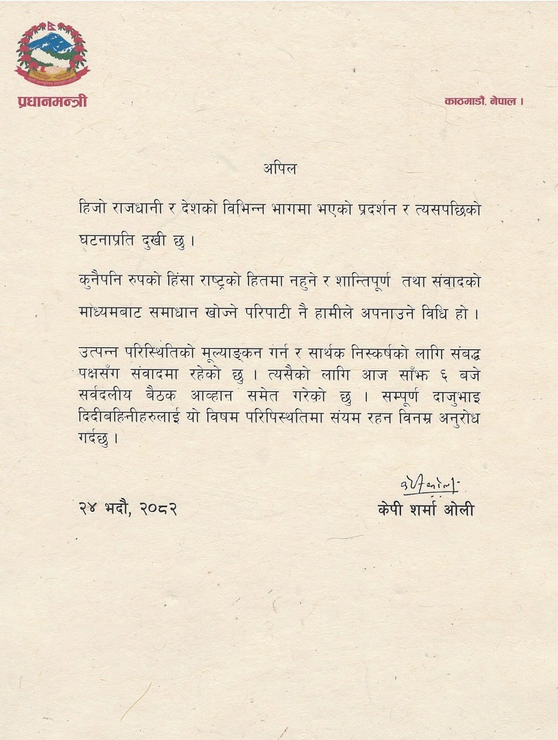 अपिलमार्फत् प्रधानमन्त्री ओलीले हिंसात्मक गतिविधि राष्ट्रको हितविपरीत हुने भन्दै विवादको समाधान शान्तिपूर्ण संवादमार्फत खोज्नु उपयुक्त विकल्प भएको बताएका छन्।