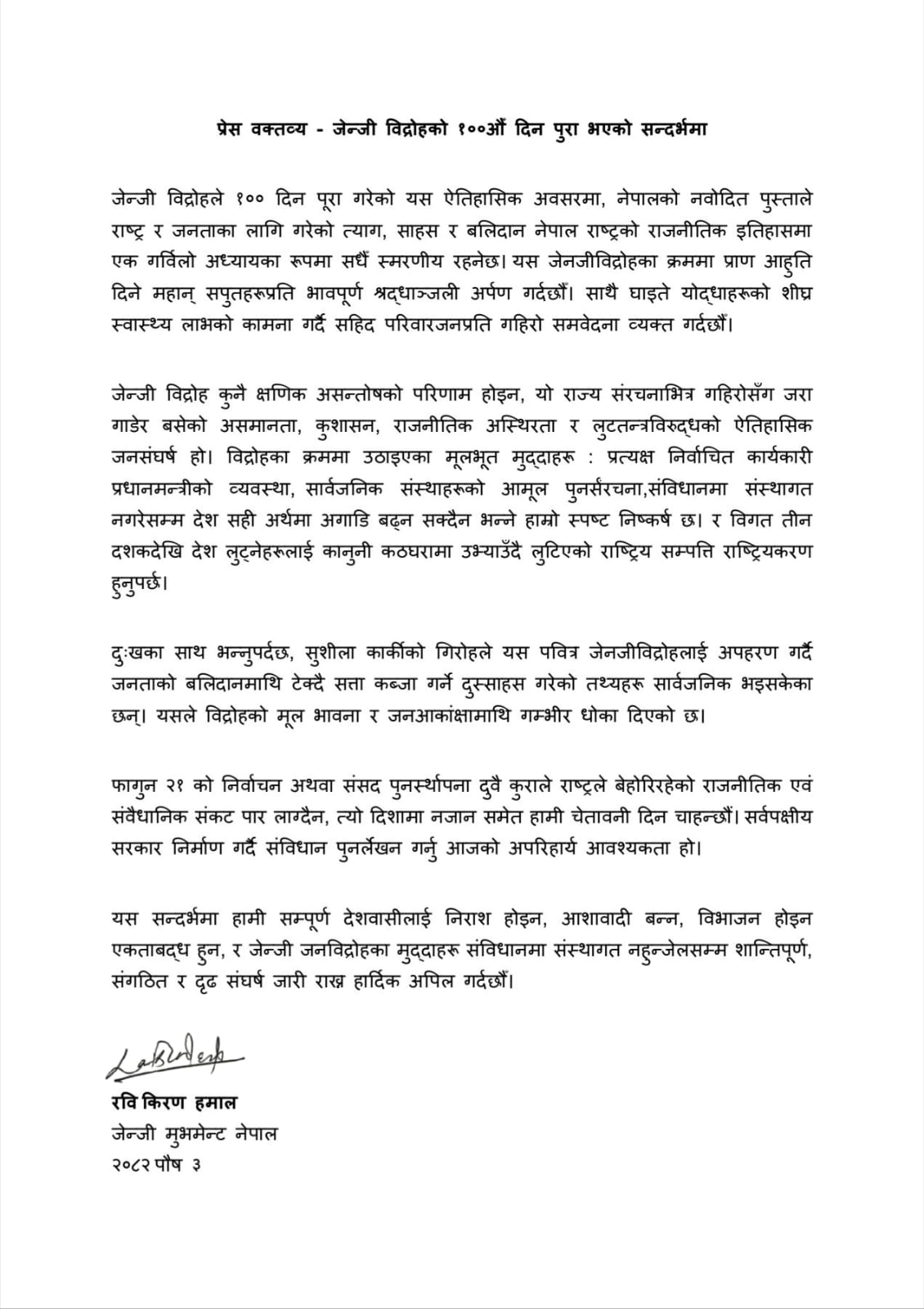 जेन्जी अगुवा रवि किरण हमालले जारी गरेको प्रेस वक्तव्यमा नेपालको नवोदित पुस्ताले राष्ट्र र जनताका लागि गरेको त्याग, साहस र बलिदानलाई नेपालको राजनीतिक इतिहासको गर्विलो अध्यायका रूपमा उल्लेख गरिएको छ। विद्रोहका क्रममा ज्यान गुमाउनेप्रति श्रद्धाञ्जली अर्पण गर्दै घाइतेहरूको शीघ्र स्वास्थ्य लाभको कामना र सहिद परिवारप्रति समवेदना व्यक्त गरिएको छ।